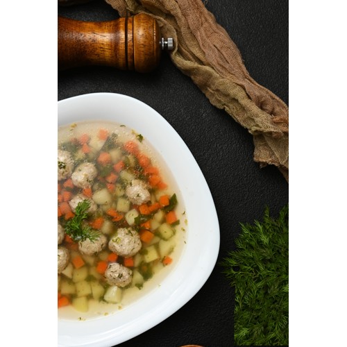 ziemniaki (43%), pulpeciki z mięsa wieprzowiny (wieprzowina półtłusta, jaja kurze, sól, pieprz czarny mielony - 30%), marchewka (15%), cebula (8%), koperek świeży, natka pietruszki świeża.